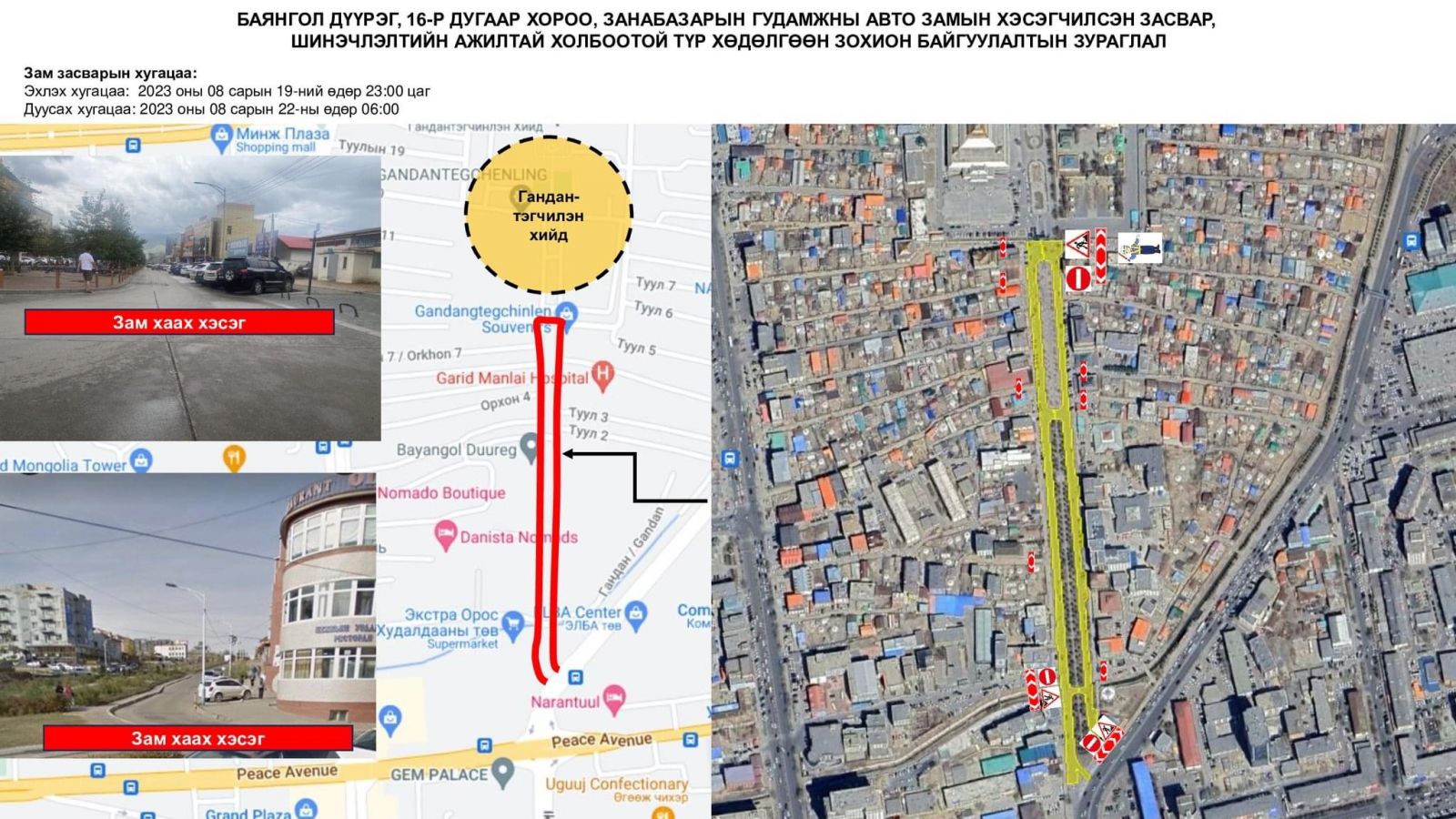 Баянгол дүүрэг 16 дугаар хороо Занабазарын гудамж буюу Гандантэгчэнлин хийдийн урд талын авто замын хөдөлгөөнийг хязгаарлаж, засварын ажил гүйцэтгэх гэж байна.