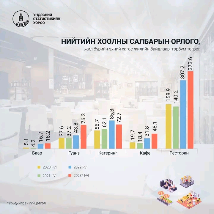 Нийтийн хоолны салбарын орлого 2023 оны эхний хагас жилд 588.8 тэрбум төгрөг болж, өмнөх оны мөн үеэс 104.0 (21.5%) тэрбум төгрөгөөр өссөн байна.