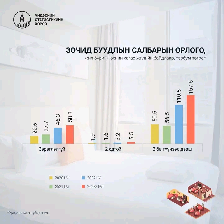 Харин зочид буудлын салбарын орлого 2023 оны эхний хагас жилд 221.0 тэрбум төгрөг болж, өмнөх оны мөн үеэс 61.0 (38.1%) тэрбум төгрөгөөр өсжээ.