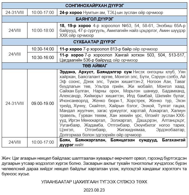 Өнөөдөр буюу 2023 оны наймдугаар сарын 24-ний Пүрэв гарагт хийх засварын хуваарийг танилцуулж байна. Хэрэглэгч та бүхэн засвар хийх хугацаанд хэрэглээгээ түр зохицуулна уу.