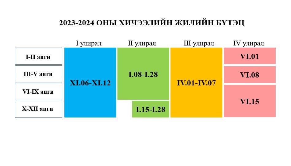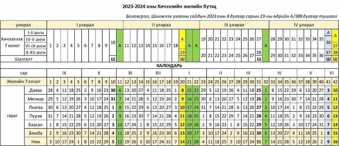 Сургуулийн өмнөх болон ерөнхий боловсролын хичээл сургалтын үйл ажиллагааг есдүгээр сарын 1-ний өдөр эхлүүлэх хуулийн зохицуулалттай. Харин хичээлийн жилийн бүтцийг боловсрол, шинжлэх ухааны сайд баталдаг. Тэгвэл сайдын 2023 оны наймдугаар сарын 23-ны өдрийн А/388 дугаар тушаалаар хичээлийн жилийн бүтцийг шинэчлэн баталлаа.