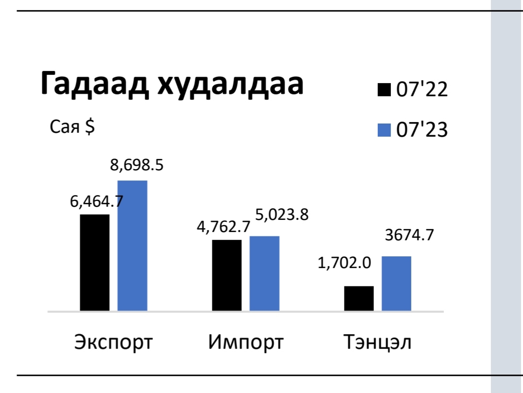 Харин 2023 оны долоодугаар сард экспорт өмнөх сараас 128.4 (10.1%) сая ам.доллароор, импорт 60.7 (7.5%) сая ам.доллароор тус тус буурсан байна.