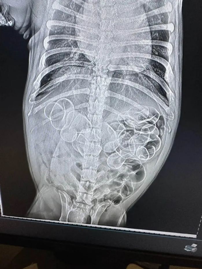 Франц бульдог нохойн эзэн Лю хэмээх бүсгүй гэрт нь байсан резинэн нугаснууд алга болсон байгааг анзаарчээ. Ундаа худалдаж авах үед үнэгүй өгдөг эдгээр нугаснуудыг нохой нь залгисан байж магадгүй хэмээн бодсон Лю яаралтай мал эмнэлэгт ханджээ. Мал эмнэлгийнхэн нохойн ходоодны рентген зургийг аваад цочролд оржээ.