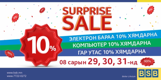 Монголын хамгийн том электрон бараа, компьютер, гар утасны BSB-н бүх салбар дэлгүүрүүд 8-р сарын 29, 30, 31-ний Мягмар, Лхагва, Пүрэв гарагуудад ердөө 3-хан өдөр SURPRISE SALE зарлаж БҮХ БАРАА-гаа 10% хямдруулж байна.