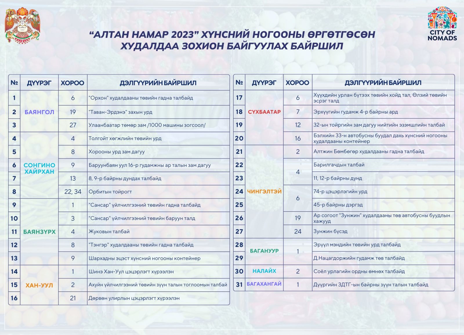 Хөдөө аж ахуйн бүтээгдэхүүний үйлдвэрлэл, борлуулалтын сүлжээг нэмэгдүүлэх, нийслэлийн иргэдийг шинэ ургацын төмс, хүнсний ногоогоор хангах “Алтан намар 2023” хүнсний ногооны өргөтгөсөн худалдааг нийслэлийн 31 байршилд зохион байгуулахаар төлөвлөсөн. Өнөөдрийн байдлаар 23 байршилд төмс, хүнсний ногооны өргөтгөсөн худалдаа гарчээ.