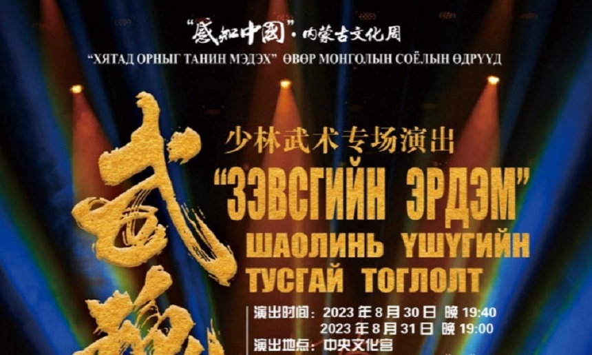 Өнөөдөр буюу наймдугаар сарын 30 өдөр соёлын төв өргөөнд Соёлын өдрийн нээлт "Зэвсгийн эрдэм" Шаолинь Үшүгийн тусгай тоглолтоор эхэлнэ. Энэхүү тоглолтыг хоёр удаа тоглуулахаар бэлтгэсэн байна. Тоглолтоор БНХАУ-ын онцлогийг харуулдаг Шаолинь Үшүгийн урлагийн тухай ойлголтыг авахаас гадна, энэхүү өв уламжлалын талаар танин мэдэх боломжийг олгох юм.