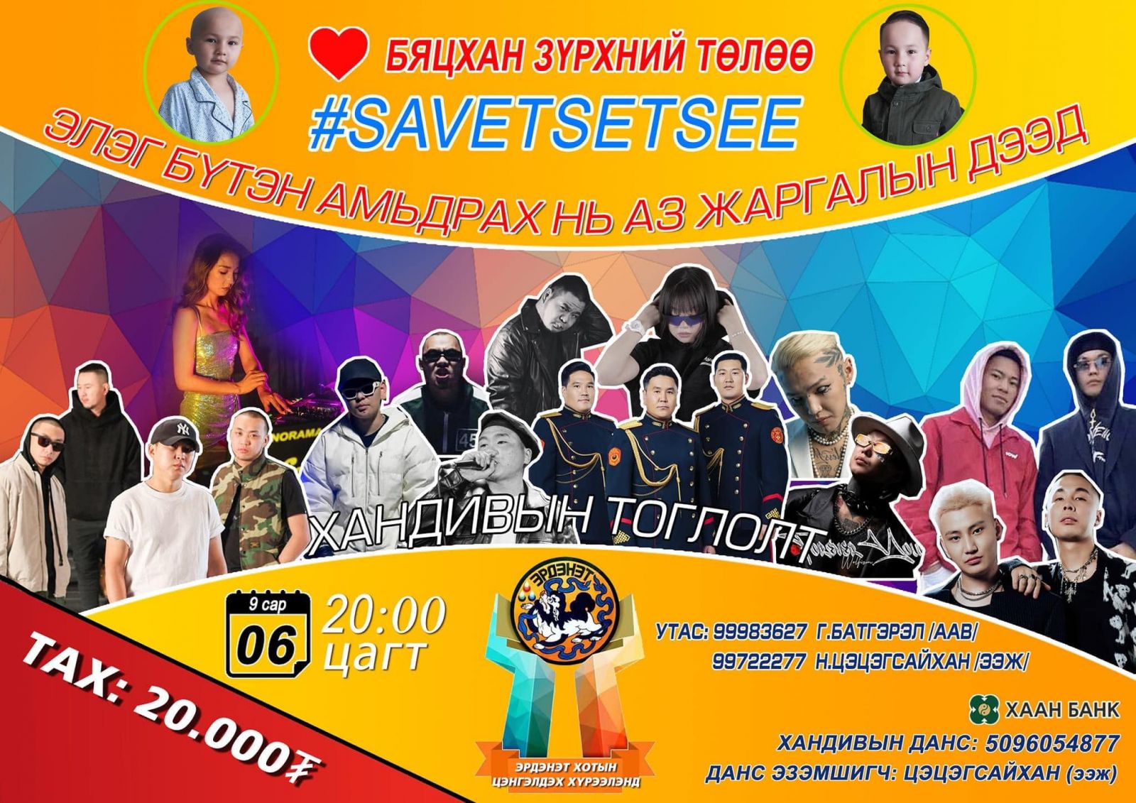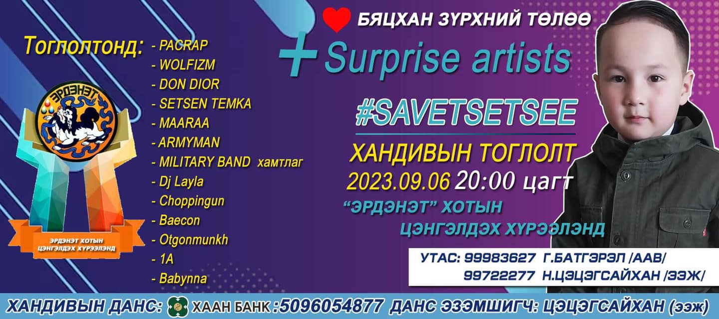 Хүүгийн эмчилгээний зардалд шаардлагатай байгаа 588.000.000 төгрөгийг цуглуулах зорилгоор "Бяцхан зүрхний төлөө" хандивын тоглолт энэ сарын 6-ний өдөр зохион байгуулах гэж байна. Өдөр ирэх тусам хүүгийн өвдөлт нэмэгдэн, бяцхан зүрхэндээ эдгэнэ гэх итгэл тээн хүнд өвчинтэй тэмцэж буй Б.Цэгцбилэг хүүд зориулсан тоглолтод хүрэлцэн ирэхийг урьж байна.