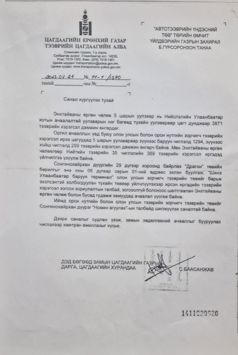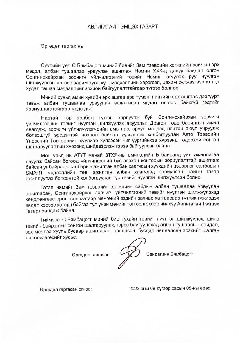 Энэ талаар сайд С.Бямбацогт "Зам Тээврийн Хөгжлийн сайдын хувьд зам тээврийн салбар, тэр дундаа төмөр зам, авто тээвэртэй холбоотой олон жил бугшсан хулгай луйврын асуудалтай тууштай тэмцэж буй минь олон хүний амин хувийн эрх ашиг, ашиг хонжоо олох гэсэн бусармаг үйлдэлд саад тотгор болж, хулгайн мөнгө, эрх мэдлээ алдахгүй гэсэн этгээдүүд зохион байгуулалттайгаар худал мэдээлэл гарган, гүтгэн гүжирдэх явдал хэрээс хэтэрлээ.Мөнгөний боол болсон увайгүй нөхдийн захиалгаар сэтгүүл зүйн нэр барьсан ичгүүр сонжуургүй хэсэг этгээд намайг Сонгинохайрхан зорчигч үйлчилгээний төвийг албаны эрх мэдэл, давуу байдлаа ашиглан нүүлгэн шилжүүлсэн мэтээр улангасан гүжирдэж буй нь ор үндэслэлгүй болохыг мэдэгдье.Миний хувьд АТҮТ хуулиар тогтоосон чиг үүргийнхээ хүрээнд бие дааж гаргасан шийдвэрт ямарваа нэг байдлаар хөндлөнгөөс нөлөөлж оролцсон, элдэв гэрээ байгуулсан, хувийн ашиг сонирхолд хөтлөгдсөн зүйл байхгүй тул уг асуудлаар АТГ-т хандаж шалгуулах болсноо мэдэгдэж байна.Мөн зориуд зохион байгуулалттай, захиалгатай гүтгэлгийн чанартай мэдээлэл тарааж буй этгээдүүдийг хууль хяналтын байгууллагад өгч шалгуулан нэр төрөө сэргээлгэх болно" гэв.