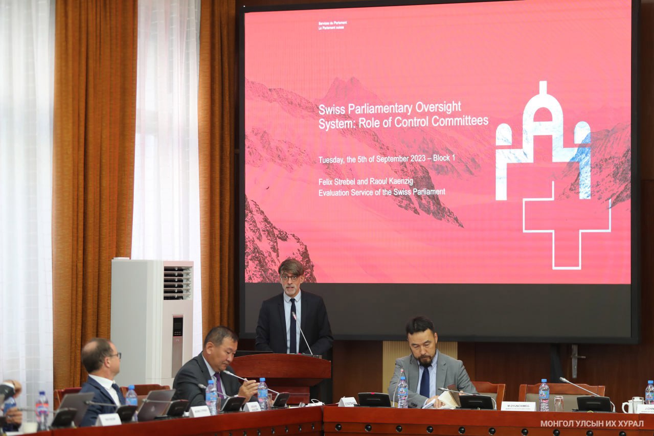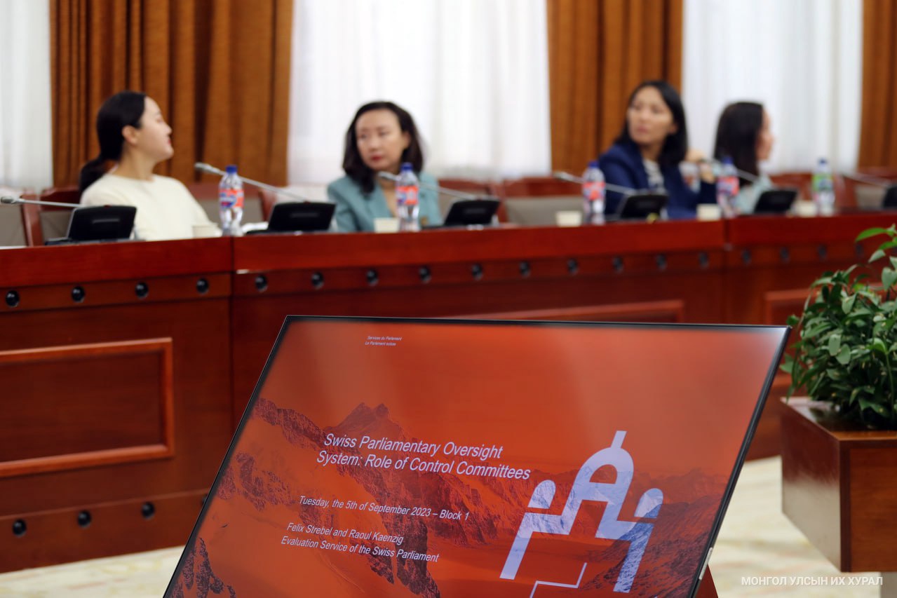 Швейцарын Холбооны Улсын Парламентын Тамгын газрын Хяналтын хэлтсийн дэд дарга Феликс Стребел, тус хэлтсийн төслийн менежер Раул Кензиг нар Улсын Их Хурлын гишүүдэд зориулан үндсэн дөрвөн сэдвийн дагуу мэдээлэл, танилцуулга хийлээ. Тухайлбал, дэлхийн улс орнуудын парламент дахь хууль тогтоомжийн хэрэгжилтийн үр дагаврын үнэлгээний талаарх харьцуулсан мэдээлэл, үнэлгээ хяналт шалгалтын мэдээлэл авах эрх-хууль эрх зүйн болон институтийн сорилт болон Швейцарын Холбооны Улсын Парламентын хяналт шалгалт, хууль тогтоомжийн хэрэгжилтийн үр дагаврын үнэлгээний үйл явц, тогтолцооны онцлогийн талаар мэдээлэл өгсөн юм.