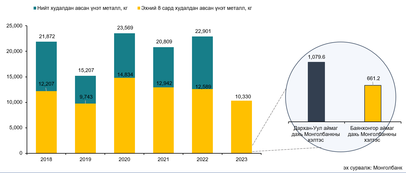 Оны эхнээс өссөн дүнгээр Дархан-Уул аймаг дахь Монголбанкны хэлтэс 1,079.6 кг, Баянхонгор аймаг дахь Монголбанкны хэлтэс 661.2 кг үнэт металл тус тус худалдан авсан.