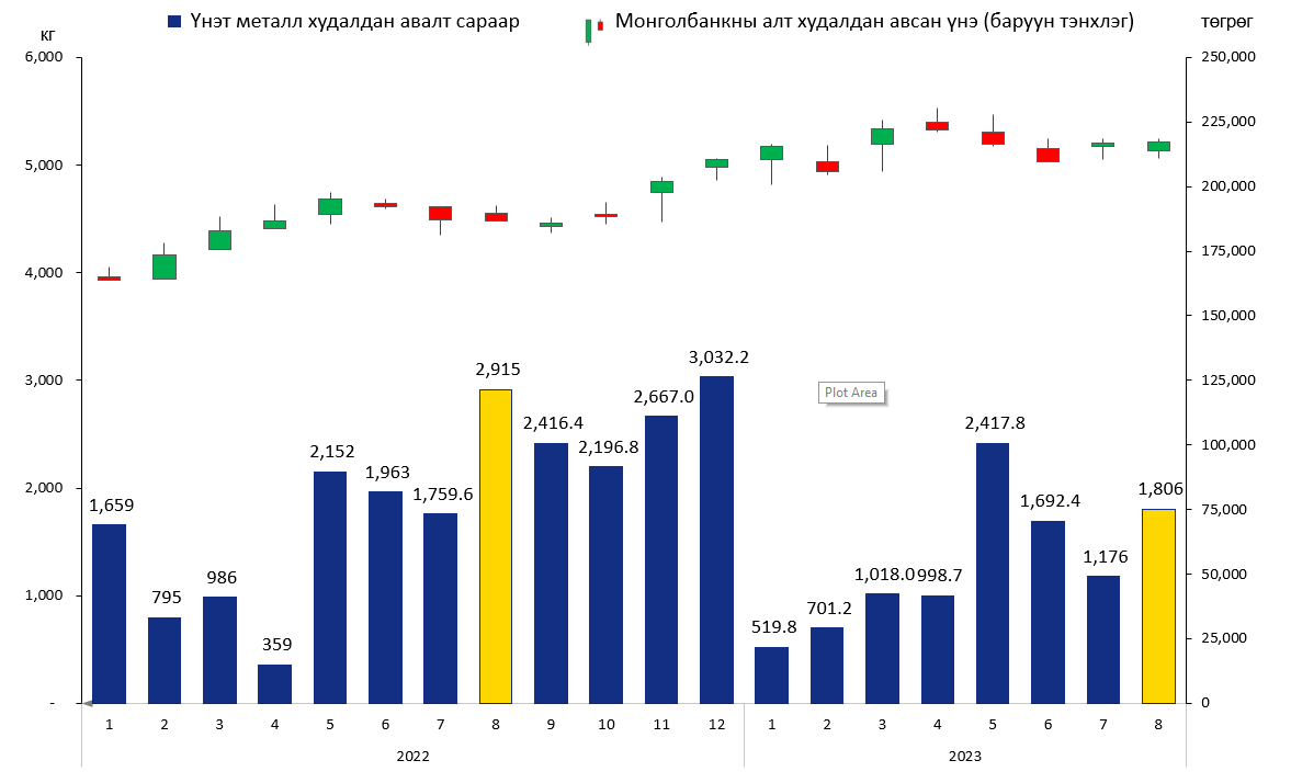 Монголбанк 2023 оны наймдугаар сард 1,805.6 кг үнэт металл худалдан авч, оны эхнээс өссөн дүнгээр 10.3 тонн үнэт металл худалдан авлаа.