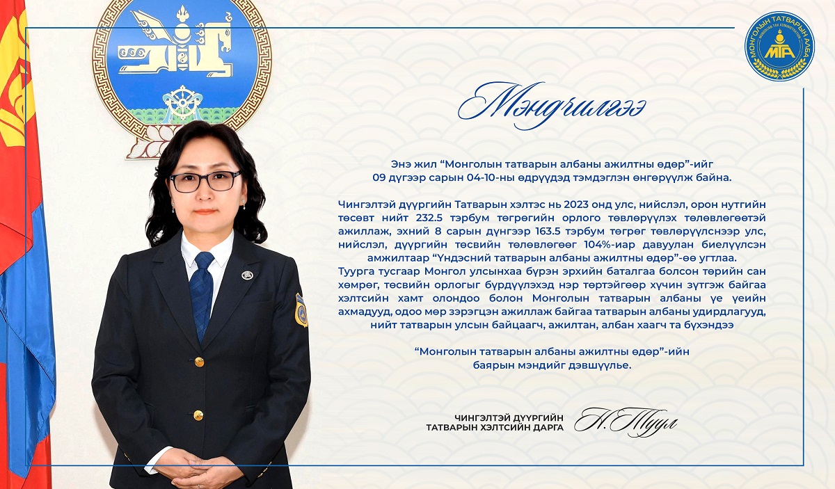 Энэ өдрийг тохиолдуулан Чингэлтэй дүүргийн Татварын хэлтсийн дарга Н.Туул салбарын нийт хамт олондоо мэндчилгээ дэвшүүллээ.
