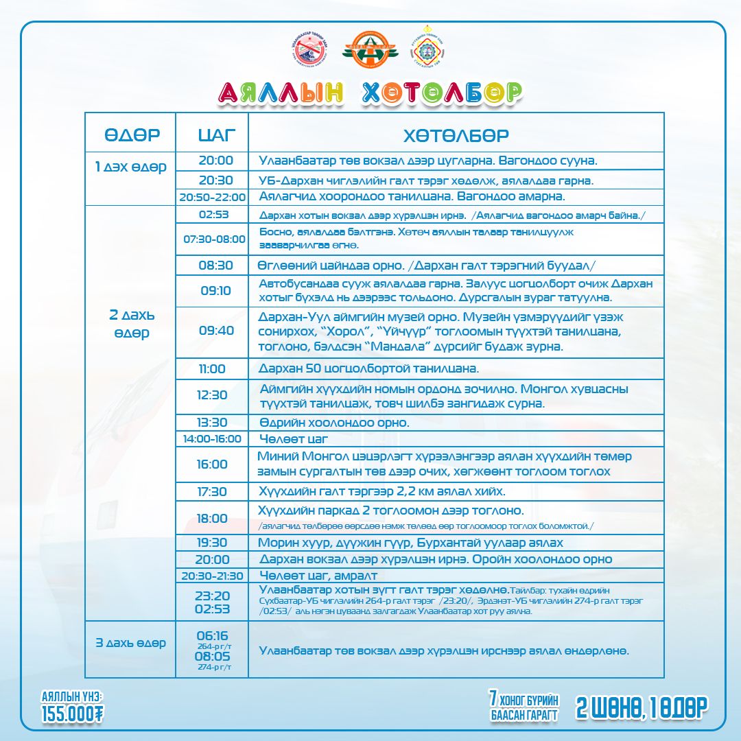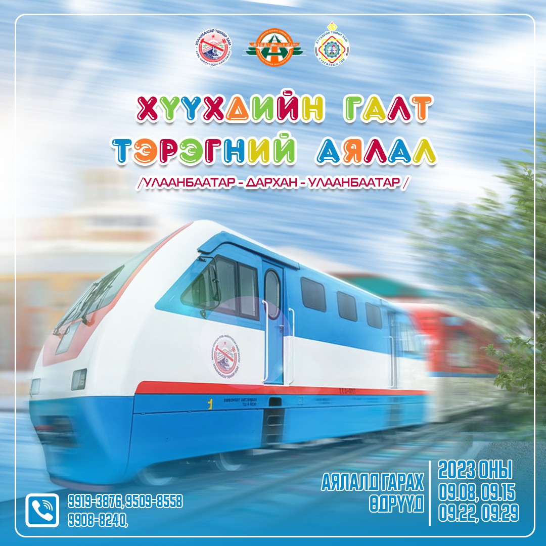 Улаанбаатар-Дархан-Улаанбаатар чиглэлд долоо хоног бүрийн баасан гарагт аялдаг энэхүү тусгай хөтөлбөртэй аялалд эцэг эхчүүд хүүхдүүдтэйгээ хамт аялж, олон сайхан мартагдашгүй дурсамжийг бүтээдэг. Хүүхэд насанд хүргэж өгдөг галт тэргээр гэр бүлээрээ тав тухтай аялж, цагийг зугаатай өнгөрүүлэх боломжийг та бүү алдаарай хэмээн "УБТЗ" ХНН-ээс мэдээллээ.