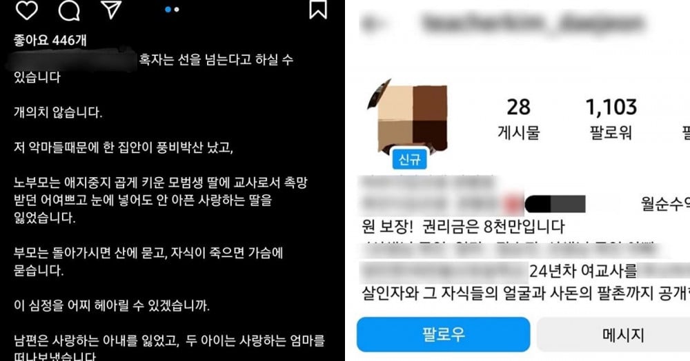 Есдүгээр сарын 11-ний өдөр инстаграмаар талийгаачийг дарамталж байсан гэр бүлийнхэнтэй холбоотой гэрэл зураг, хувийн нууц мэдээллүүдийг олон нийтэд дэлгэж эхэлсэн байна. Энэхүү бичвэрт "Би 24 жил ажилласан багшийг амиа хорлоход хүргэсэн алуурчид болон тэдний үр хүүхэд, холын хамаатан садны хэн болохыг олон нийтэд мэдээлэх болно" гэж бичжээ. Мөн энэхүү хэрэгт холбогдсон гэр бүлийн гишүүдийн зураг болон утасны дугаар, гэрийн хаяг, ажил мэргэжил зэргийг илчилсэн 40 гаруй нийтлэл орсон байна.