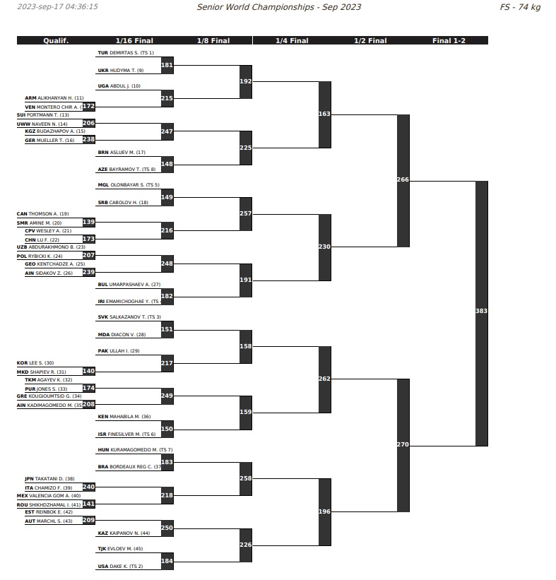 74 кг-ын жинд ОУХМ Олонбаярын Сүлдхүү, Серби Улсын тамирчин ДАШТ-ий алт, мөнгөн медальт Хетик Цаболовтой таарчээ. Манай бөх олимпын аварга Сидаковын хэсэгт орсон.