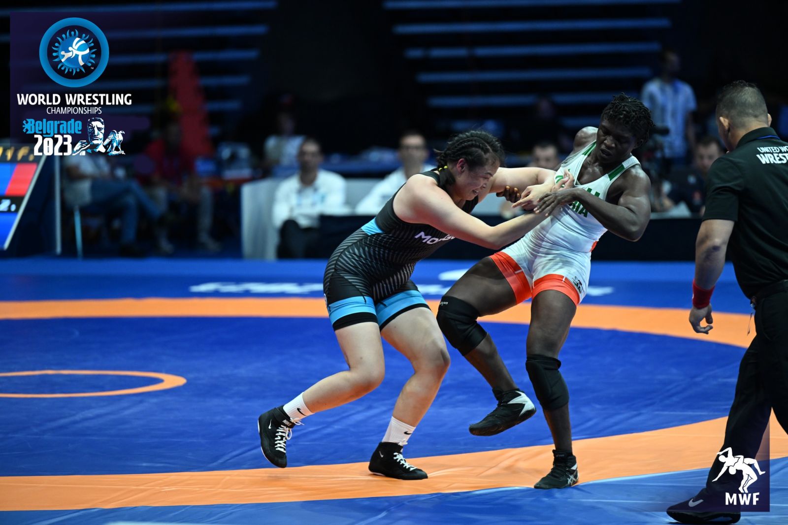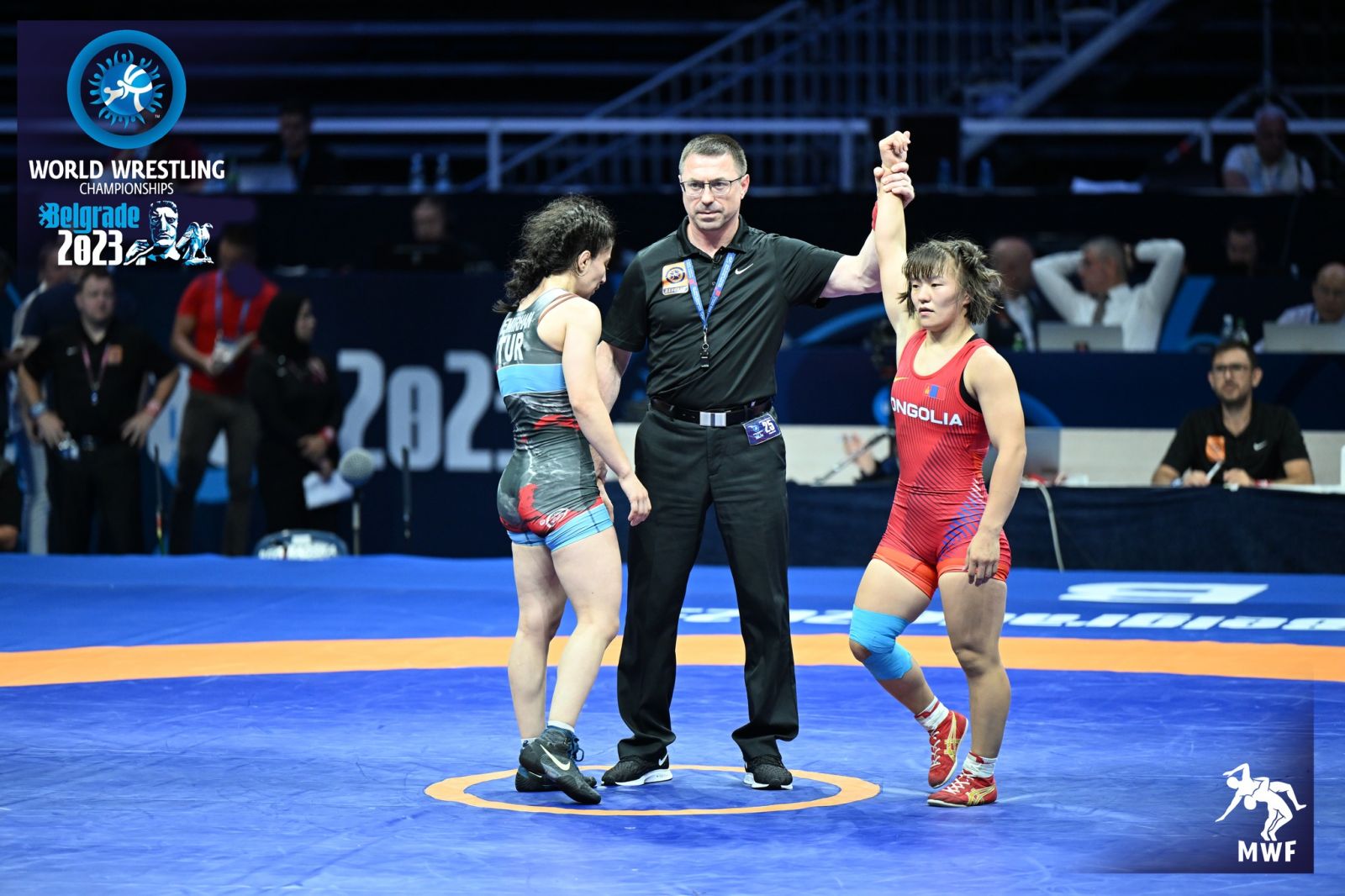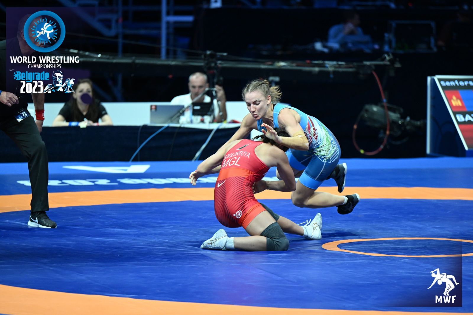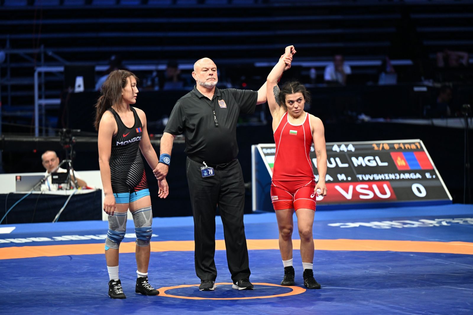 57 кг-д олимп, дэлхийн хүрэл медальт, Монгол Улсын гавьяат тамирчин Бат-Очирын БОЛОРТУЯА эхний тойрогт хийлж, хоёрдугаар тойрогт 2022 оны ДАШТ-ий хүрэл медальт, Европийн хошой аварга, дэлхийн чансааг тэргүүлэгч Украины Алина Хрушина Акобиятай барилдах байсан ч өрсөлдөгч бөх гэмтлийн улмаас гарсангүй. Ингээд гуравдугаар тойрогт Унгарын бөх Рамона Галамбошт 5:6 оноогоор ялагдав.
