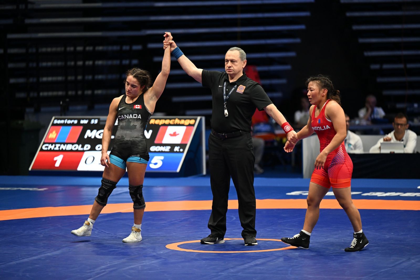 55 кг-д Японы бөх, дэлхийн хошой аварга Харүна Окүнод 2:9 оноогоор хожигдсон Ч.Отгонтуяа дагах барилдаанд дэлхийн залуучуудын аварга, Беларусын Арина Мартыноваг цэвэр ялаад, дараа нь 2022 оны ДАШТ-ий хүрэл медальт, Канадын Карла Годинест 1:5 оноогоор ялагдав.