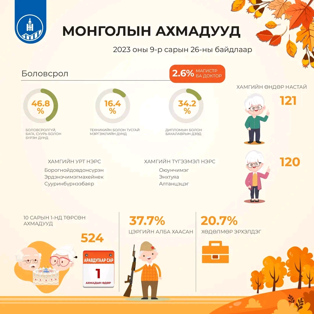 2020 онд Монгол Улсын нийт хүн амын 9.8 хувийг ахмадууд эзэлж байсан бол 2023 оны есдүгээр сарын 26-ны байдлаар 8.6 хувийг эзэлж байна.