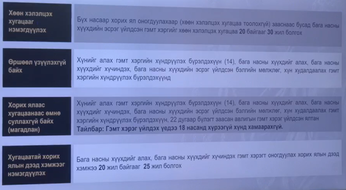 Тэрбээр "Ерөнхий сайдаас өгсөн үүрэг чиглэлийн дагуу хүүхэд, тэр дундаа бага насны хүүхдийн эсрэг гэмт хэргийн ялын бодлогыг чангалах тухай урьдчилсан байдлаар танилцууллаа. Засгийн газрын өнөөдрийн хуралдаанаар хэлэлцээд УИХ-д өргөн барих нь зүйтэй гэж шийдвэрлэсэн. Төслийн талаар танилцуулга хийнэ. Үүнээс өмнө иргэдээс нэг зүйлийг хүсэх байна. Энэ танилцуулгад дурдагдаж байгаа мэдээлэл, тоо нь олон иргэдийн сэтгэлийг түгшээх, хямрааж болзошгүй. Түгээхдээ хэвлэл мэдээллийн сэтгүүлчдийг дэвэргэж, асуудалд хандахгүй байхыг хүсэж байна" хэмээн мэдээллийнхээ эхэнд тодотголоо.