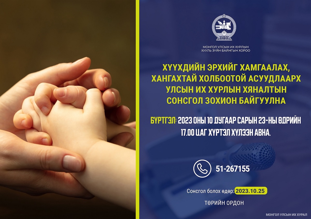 Монгол Улсын Их Хурлын Хууль зүйн байнгын хорооноос Хүүхдийн эрхийг хамгаалах, хангахтай холбоотой асуудлаарх Улсын Их Хурлын хяналтын сонсголыг 2023 оны аравдугаар сарын 25-ны өдрийн 10 цагт Төрийн ордны “Их Эзэн Чингис хаан” танхимд зохион байгуулах тул төрийн байгууллага, албан тушаалтан, иргэн, хуулийн этгээд болон шинжээч, ажиглагч, хэвлэл мэдээллийн байгууллагуудын төлөөлөл Та бүхнийг оролцохыг урьж байна.
