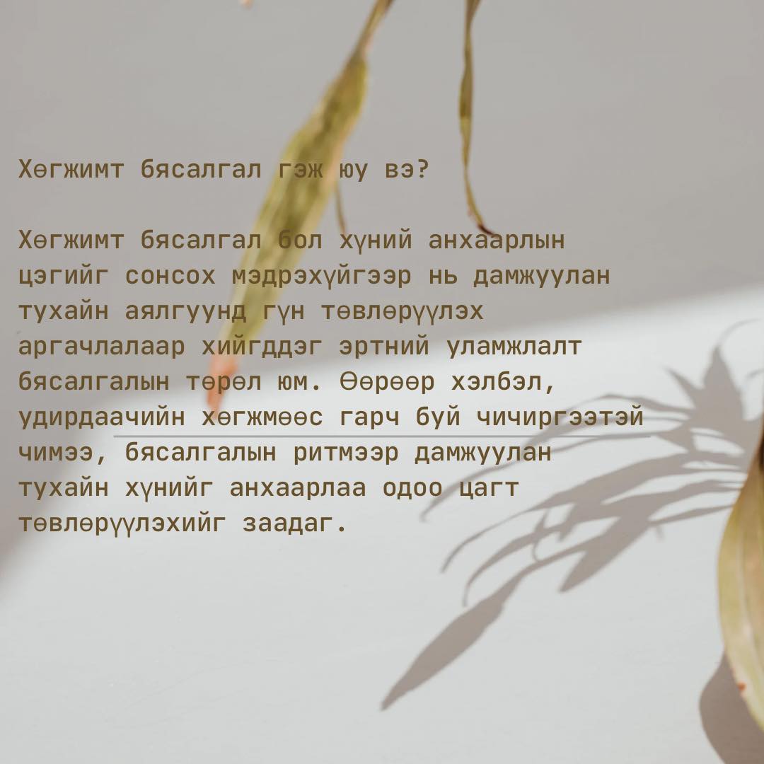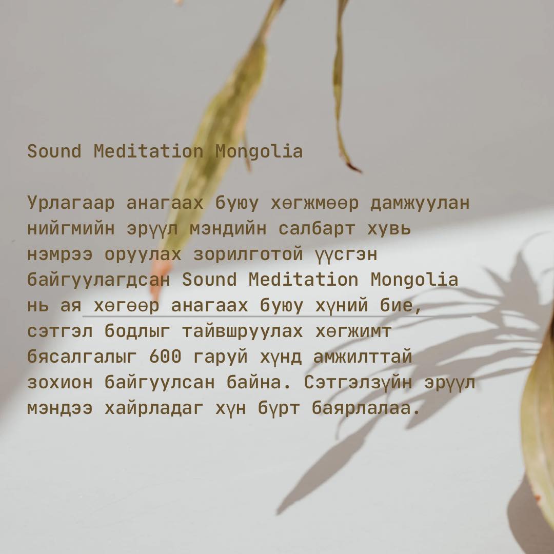 Урлагаар анагаах буюу хөгжмөөр дамжуулан нийгмийн эрүүл мэндийн салбарт хувь нэмрээ оруулах зорилготой үүсгэн байгуулагдсан Sound Meditation Mongolia нь ая хөгөөр анагаах буюу хүний бие, сэтгэл бодлыг тайвшруулах хөгжимт бясалгалыг 600 гаруй хүнд амжилттай зохион байгуулсан байна.