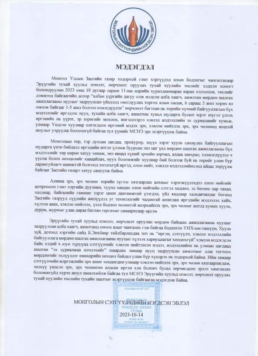 Монгол Улсын Засгийн газар тодорхой гэмт хэргүүдэд ялын бодлогыг чангатгахаар Эрүүгийн тухай хуульд нэмэлт, өөрчлөлт оруулах тухай хуулийн төслийг хэдхэн хоногт боловсруулан 2023 оны 10 дугаар сарын 11-ны өдрийн хуралдаанаараа яаран хэлэлцэж, төслийг дэмжээд байгаагийн дотор “албан үүргийн дагуу олж мэдсэн алба хаагч, ажилтан мөрдөн шалгах ажиллагааны нууцыг задруулсан үйлдэлд оногдуулах торгох ялын хасаж, 6 сараас 3 жил хорих ял оноож байгааг 1-5 жил болгон нэмэгдүүлэх” өөрчлөлт багтсан нь төрийн хүчний байгууллагын бүх мэдээллийг иргэдээс нуух, тухайн алба хаагч, ажилтны хувьд шударга бусын эсрэг шүгэл үлээх иргэнийх нь үүрэг, эр зоригийг мохоох, ингэснээрээ хэвлэл мэдээллийн эх сурвалжийг хумьж, улмаар Үндсэн хуулиар олгогдсон иргэний мэдэх эрх, хэвлэн нийтлэх эрх, эрх чөлөөнд ноцтой аюулыг учруулж болзошгүй байгаа тул үүнийг МСНЭ эрс эсэргүүцэж байна.