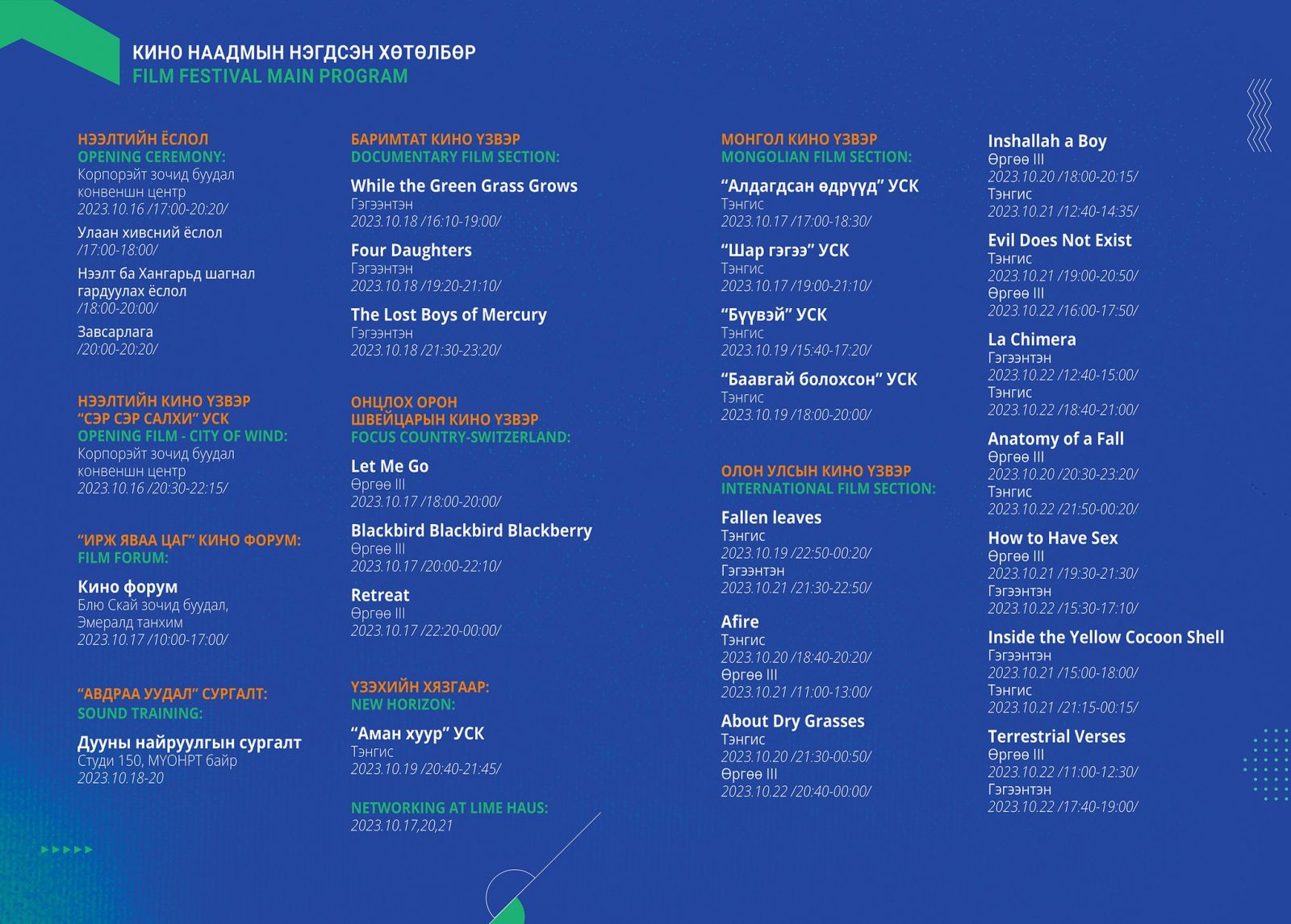 Энэхүү наадмыг Венецийн кино наадмын “Ориззонти” төрөлд шалгарсан “Сэр сэр салхи” УСК нээх бол “Баавгай болохсон”, “Шар гэгээ”, “Алдагдсан өдрүүд”, “Бүүвэй” хэмээх дөрвөн бүтээл “Монгол кино хөтөлбөр”-т багтаж, наадмын үзвэрээр үзэгчдийн хүртээл болох аж.