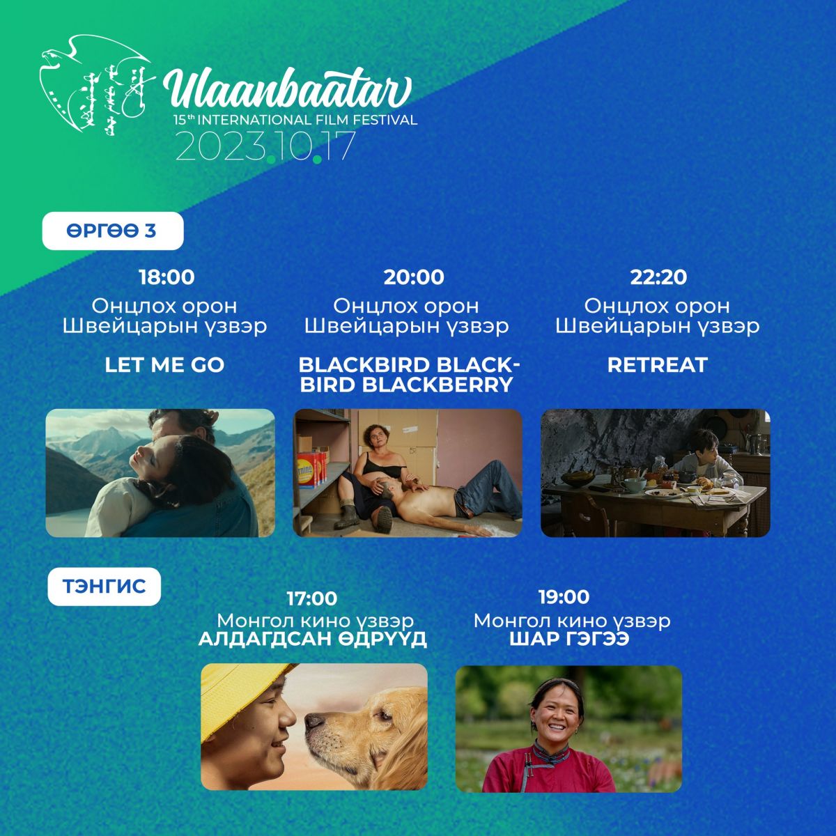 Энэ жилийн хувьд олон улсын 10, онцлох орон болох Швейцар улсын гурав, баримтат гурав, монголын дөрөв, "Үзэхийн хязгаар" хэсэгт багтсан нэг болон нээлтийн үзвэр зэрэг нийт 22 уран бүтээлийг бид гурван кино театрын дэлгэцээр хүлээн авах боломжтой.