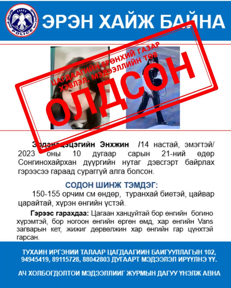 Сонгинохайрхан дүүргийн нутаг дэвсгэрээс сураггүй алга болсон гэх "Э" охиныг 2023 оны 10 дугаар сарын 21-ний өдрөөс эрэн хайх ажиллагааг зохион байгуулж байсан.