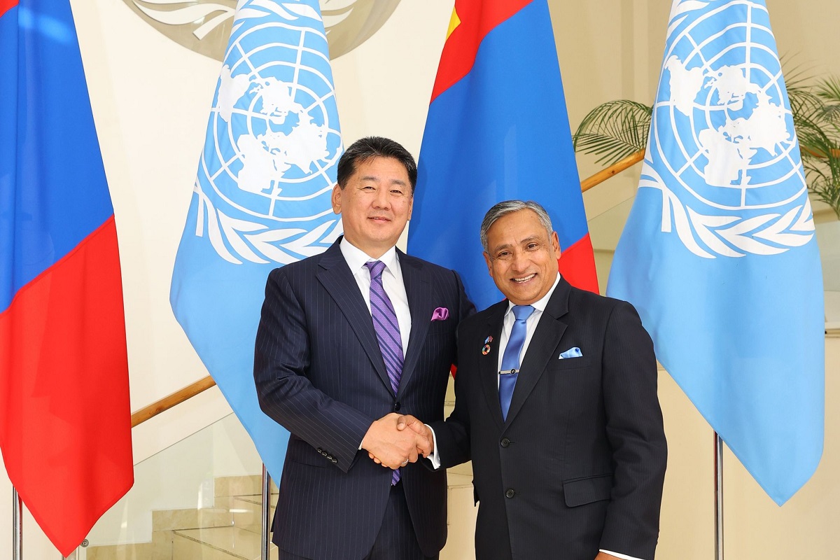 Монгол Улсын Ерөнхийлөгчийг хүрэлцэн ирэхэд Монгол Улс дахь НҮБ-ын Суурин зохицуулагч Тапан Мишра угтав. НҮБ-ын хамт олны төлөөлөл Монгол Улсын Ерөнхийлөгчид НҮБ болон түүний төрөлжсөн байгууллагуудын Монгол Улсад явуулж буй үйл ажиллагааны талаар танилцуулав.