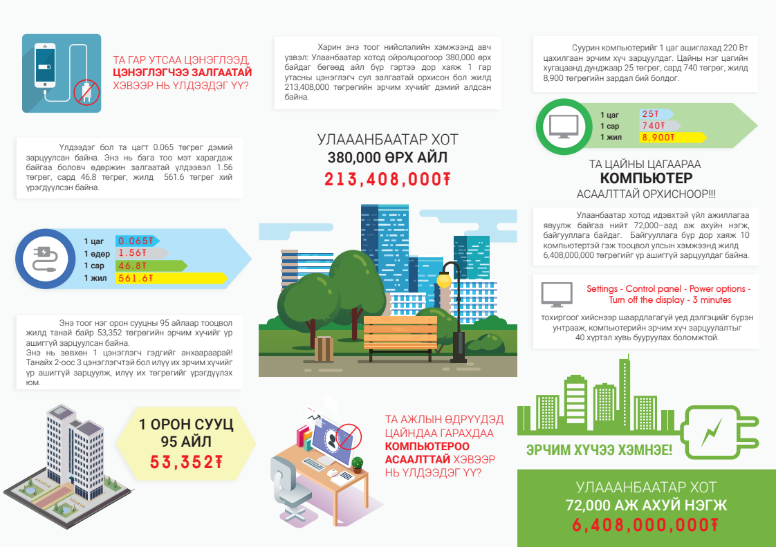 Харин энэ тоог нийслэлийн хэмжээнд авч үзвэл: Улаанбаатар хотод ойролцоогоор 380,000 өрх байдаг бөгөөд айл бүр гэртээ дор хаяж 1 гар утасны цэнэглэгч сул залгаатай орхисон бол жилд 213,408,000 төгрөгийн эрчим хүчийг дэмий алдсан байна.