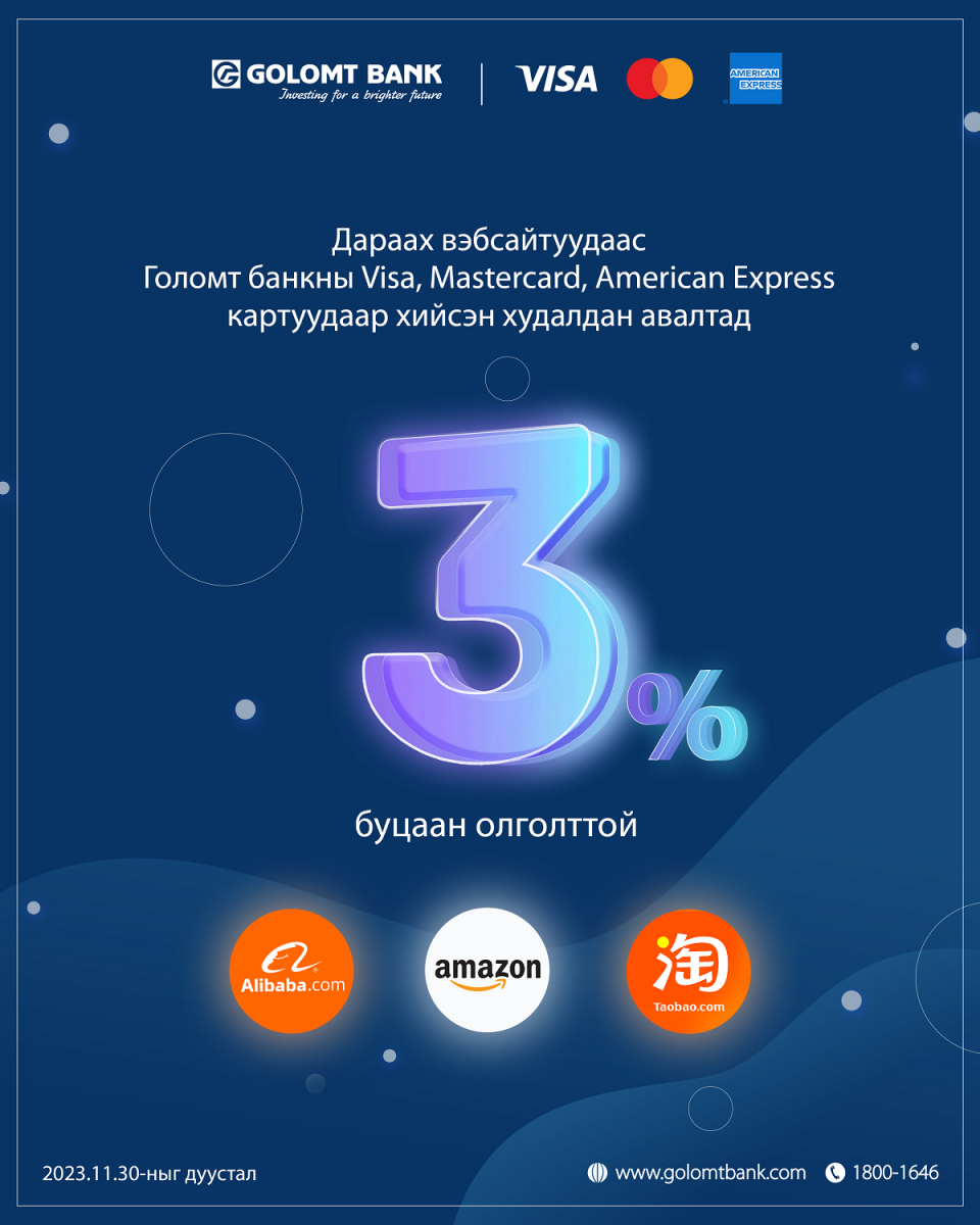 Хэрвээ та Голомт банкны Visa, Master, American Express брэндийн картын харилцагч бол картаараа доор дурдсан вэбсайтуудаас онлайн худалдан авалт хийж, төлбөрөө төлөөд үнийн дүнгийнхээ 3%-ийг буцаан аваарай.