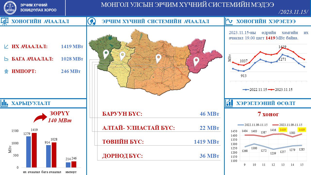 2023.11.09-11.15-ны 7 хоногт эрчим хүчний системийн хамгийн их оргил ачаалал 2023.11.13 болон 15-ны өдрүүдэд 1419 МВт, хамгийн их импорт 2023.11.11-ний өдөр 311 МВт хүрсэн байна.