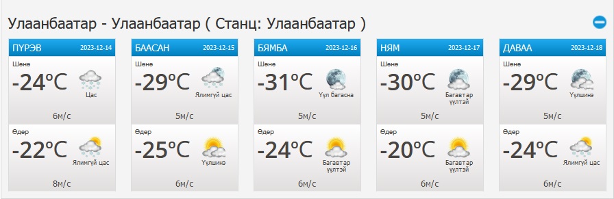 УЛААНБААТАР ХОТ ОРЧМООР: Үүлэрхэг, ялимгүй цас орно. Салхи хойноос секундэд 4-9 метр. Шөнөдөө Яармаг-Сонгины орчмоор -35...-37 градус, бусад хэсгээр -29...-31 градус, өдөртөө -24...-26 градус хүйтэн байна.