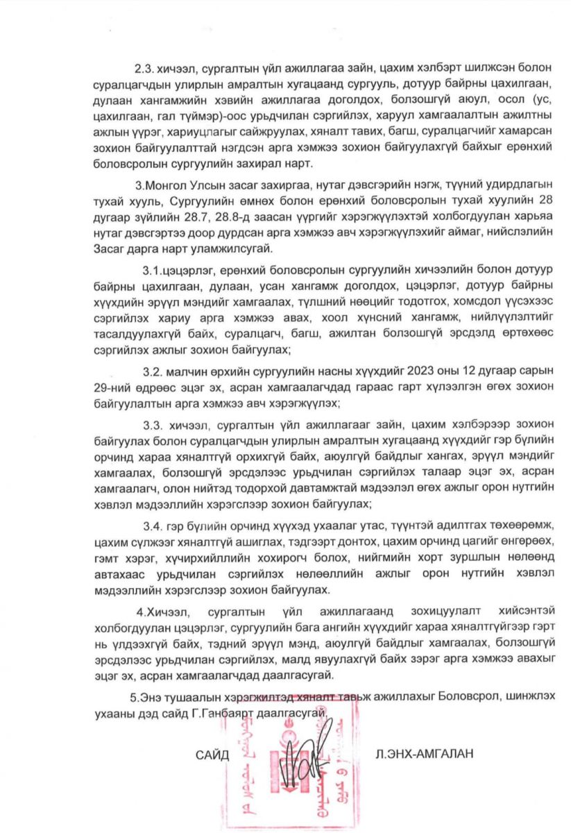 Тодруулбал, 12 дугаар сарын 18 буюу маргаашаас 1-5 дугаар ангийн сурагчдын хичээлийг цахимд шилжүүлж байна. Харин дунд, ахлах ангийн сурагчдын хичээлийг энэ сарын 25-наас цахимаар хичээллүүлнэ. Өвлийн улирлын амралт 12 дугаар сарын 28-наас нэгдүгээр сарын 28 хүртэл үргэлжлэхээр шийдвэрлэлээ.