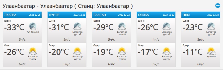 УЛААНБААТАР ХОТ ОРЧМООР: Багавтар үүлтэй. Цас орохгүй. Салхи баруун хойноос секундэд 3-8 метр. Шөнөдөө Яармаг-Сонгины орчмоор -38...-40 градус, бусад хэсгээр -32...-34 градус, өдөртөө -25...-27 градус хүйтэн байна.