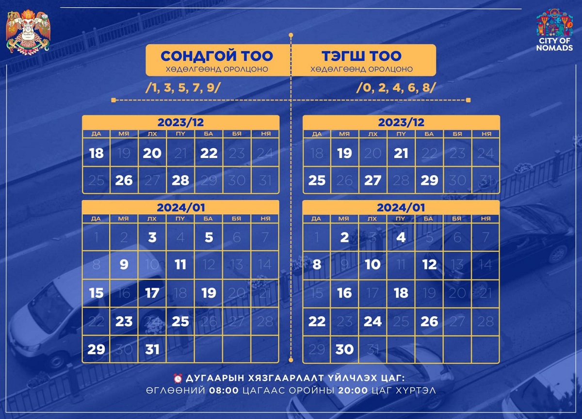 Замын хөдөлгөөний түгжрэл, ачааллыг бууруулах зорилгоор 2023 оны арванхоёрдугаар сарын 18-наас 2024 оны нэгдүгээр сарын 31-нийг дуустал автомашиныг улсын дугаарын тэгш, сондгойгоор замын хөдөлгөөнд оролцуулахаар шийдвэрлэсэн.