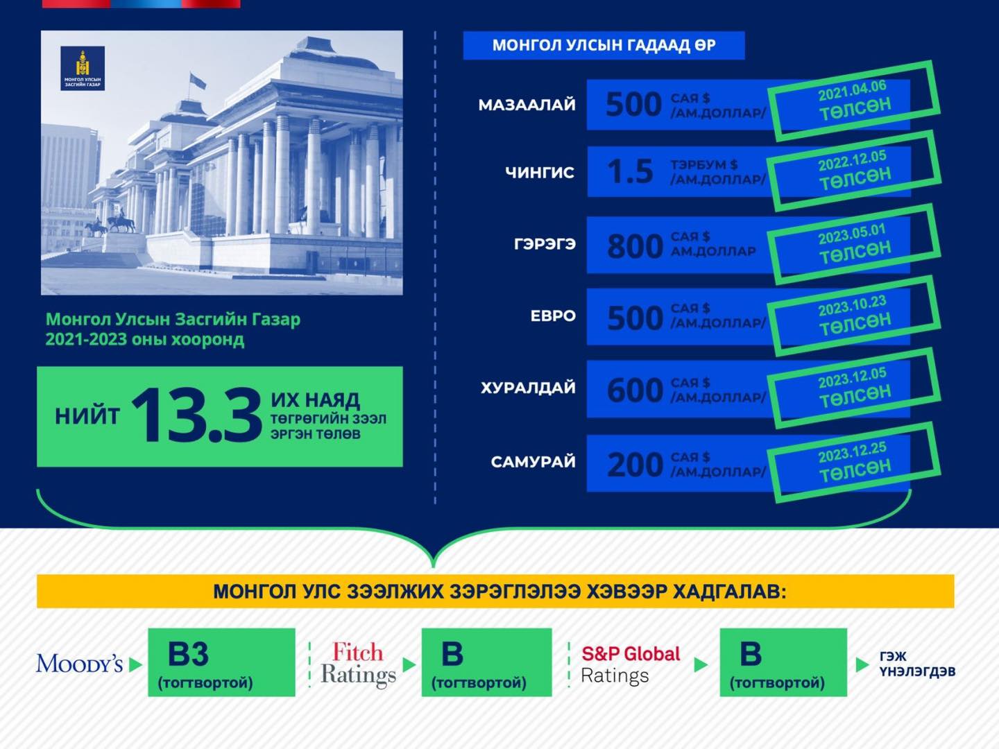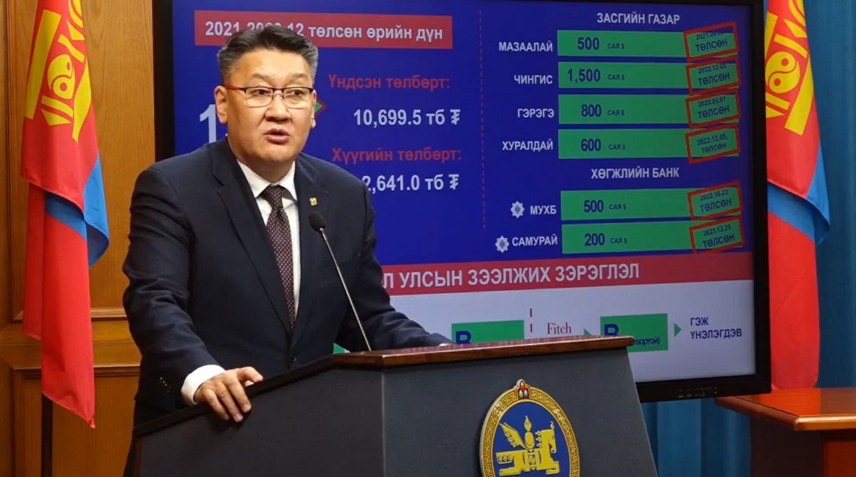 Монгол Улсын Засгийн газар 2021-2023 онд 13,3 их наяд төгрөгийн гадаад өрийг төлж барагдуулж байгаа юм. Ингэснээр 12 жил үргэлжилсэн өрийн дарамтаас Монгол Улс гарч байна.