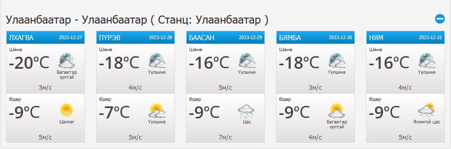 УЛААНБААТАР ХОТ ОРЧМООР: Багавтар үүлтэй. Цас орохгүй. Салхи баруун хойноос секундэд 3-8 метр. Шөнөдөө Яармаг-Сонгины орчмоор -24...-26 градус, бусад хэсгээр -19...-21 градус, өдөртөө -8...-10 градус хүйтэн байна.