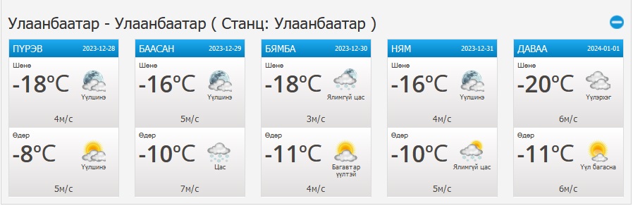 УЛААНБААТАР ХОТ ОРЧМООР: Багавтар үүлтэй. Цас орохгүй. Салхи баруунаас секундэд 3-8 метр. Шөнөдөө Яармаг-Сонгины орчмоор -24...-26 градус, бусад хэсгээр -17...-19 градус, өдөртөө -7...-9 градус хүйтэн байна.