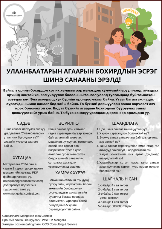 Утааг багасгаж чадах сурагчдын шинэ санааг бид хайж байна. Та бүхний дэвшүүлсэн санаа өөрчлөлт авч ирэх боломжтой юм. Бид та бүхнийг агаарын бохирдлыг бууруулах санал дэвшүүлэхийг урьж байна. Та бүхэн энэхүү уралдаанд өргөнөөр оролцоно уу.