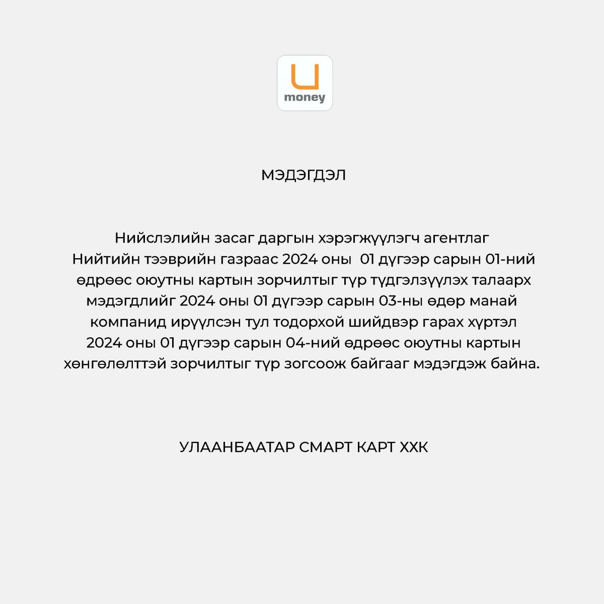 Нийтийн тээврээр оюутан сурагчдын зорчдог Umoney картаар хөнгөлөлттэй зорчих журамд өөрчлөлт орсонтой холбогдуулан "Улаанбаатар смарт карт" ХХК-аас дараах мэдэгдлийг хийжээ.