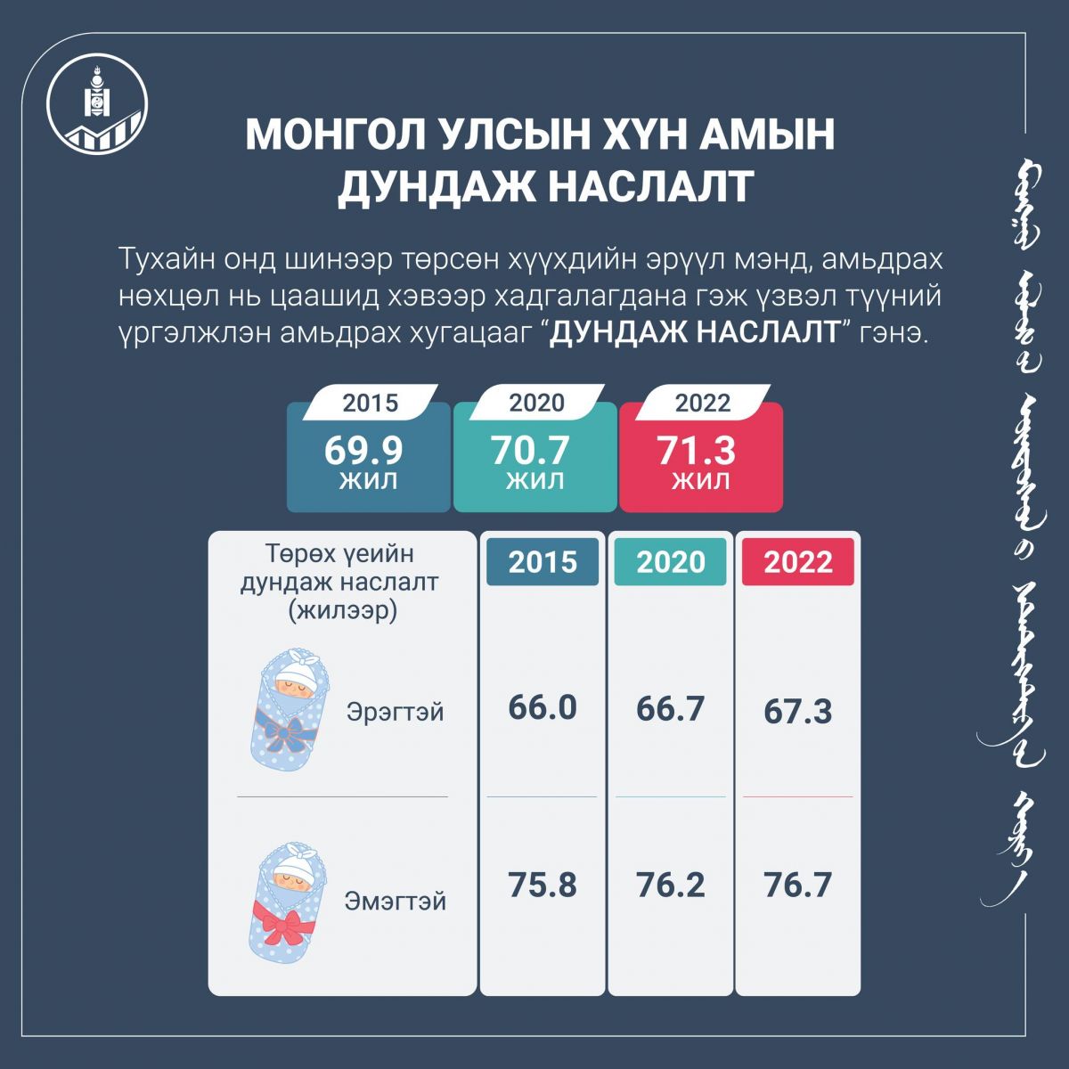 Тухайн онд шинээр төрсөн хүүхдийн эрүүл мэнд, амьдрах нөхцөл нь цаашид хэвээр хадгалагдана гэж үзвэл түүний үргэлжлэн амьдрах хугацааг “Дундаж наслалт” хэмээдэг. Эрэгтэй, эмэгтэй хүмүүсийн дундаж наслалтын зөрүү 2022 оны байдлаар 9.4 жил буюу эрэгтэйчүүдийн дундаж наслалт 67.3 харин эмэгтэйчүүдийнх 76.7 байна хэмээн Үндэсний статистикийн хорооноос мэдээлжээ.
