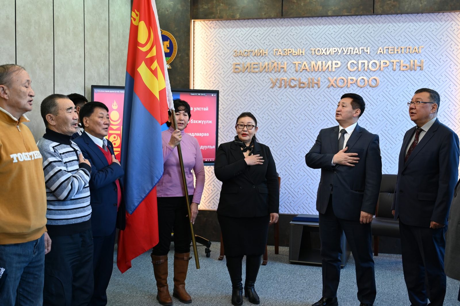 Монгол улсаас цана, тэшүүрийн төрлөөр баг тамирчид оролцох бөгөөд баг тамирчдад төрийн далбаа гардуулах ёслол болов. Арга хэмжээнд Биеийн тамир, спортын улсын хорооны дарга О.Баттулга, ОНБТСҮХ-ны Ажлын албаны дарга Э.Тэмүүжин, Монголын мастеруудын биеийн тамир, спортын хорооны ерөнхийлөгч Ч.Наранбаатар, БТСУХ-ны Бодлого төлөвлөлтийн газрын дарга О.Гэрэл, Гадаад харилцаа мэдээллийн технологийн хэлтсийн дарга Н.Оюунбат, Спортын бодлогын хэрэгжилтийн хэлтсийн ахлах мэргэжилтэн Ж.Баасансүрэн нарын хүндтэй эрхмүүд оролцлоо.