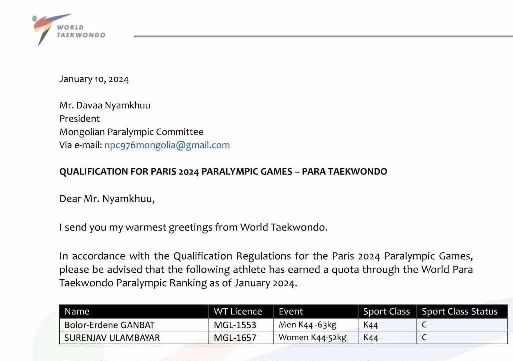 Олон улсын таеквондогийн холбооноос “Парис-2024” зуны паралимпын наадамд оролцох эрхээ авсан тамирчдыг албан ёсоор зарлахад Монголын тамирчин Г.Болор-Эрдэнэ (63 кг), У.Сүрэнжав (52 кг) нар багтлаа.