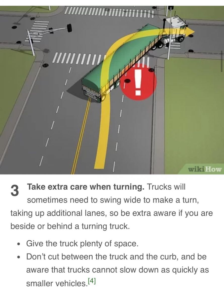 Чи тэнэг биш бол truck-тай бүү зэрэгцэж яв гэсэн бичигдээгүй хуулийг гадныхан мөрдөж байдаг. Яагаад гэвэл truck-нд дөрвөн талын үл үзэгдэх орчин/blind spot- сохор цэг/ байдаг бөгөөд ялангуяа бөөрөнд нь наалдсан яваа жижиг тэргийг жолооч олж харж болдоггүй онц аюултай байдаг. Truck болгоны чиргүүлийн ар хажууд зүүн эргэлт нь онц аюултай болохыг анхааруулсан зурагт бичээс байдаг. Манайд бол байхгүй байгаа нь дутагдал юм. Жижиг тэрэгний хүлээц муу, мангар жолооч нарт энэнийг чиргүүлийн ар дээр аваар болж бгаа зургаар харуулж наах хэрэгтэй.Юм мэдэхгүй мөртлөө биеэ тоосон , хүлээцгүй, амиа бодсон