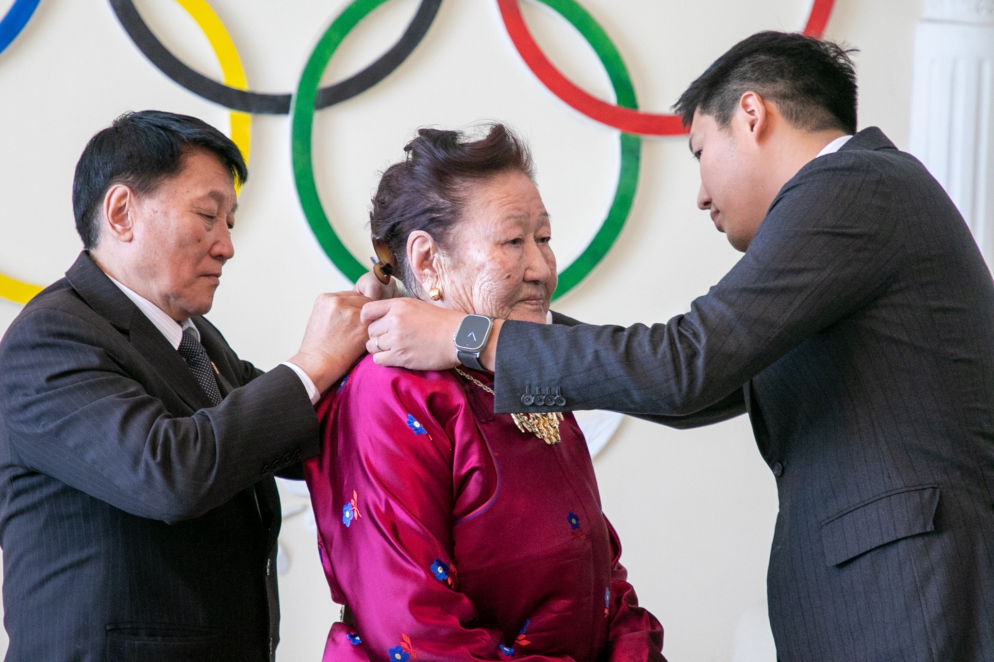 Өнөөдөр ОУОХ-ны Гишүүн, МҮОХ-ны Ерөнхийлөгч Б.Баттүшиг, Тэргүүн дэд ерөнхийлөгч Ч.Наранбаатар, Гүйцэтгэх зөвлөлийн гишүүн П.Буяндэлгэр нар өдгөө энх тунх буй “Инсбрук 1964” Олимпын наадамд оролцогч, ахмад тамирчид, зүтгэлтнүүд Л.Дашдэмбэрэл, Б.Зундуй, Д.Пүрэвлоов, Л.Боль нарыг хүлээн авч хүндэтгэл үзүүлэн, МҮОХ-ны тэргүүн дээд шагнал “Алтан од” одонг гардууллаа.