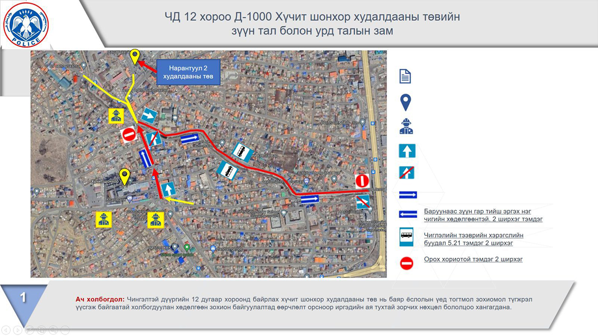 Замын хөдөлгөөний аюулгүй байдлын тухай хуулийн 8 дугаар зүйл “Цагдаагийн байгууллагын эрх үүрэг” 8.2.2-т “Замын хөдөлгөөний аюулгүй байдлыг хангах зорилгоор замын хөдөлгөөнийг зохион байгуулах, урсгал, чиглэлийг түр өөрчлөх, хязгаарлах, хаах” эрхтэй гэж заасны дагуу тухайн замыг энэ оны 02 дугаар сарын 03, 04-ний өдрүүдэд 08:00-17:00 цагийн хооронд нэг чигийн хөдөлгөөнд оруулахаар болсон.