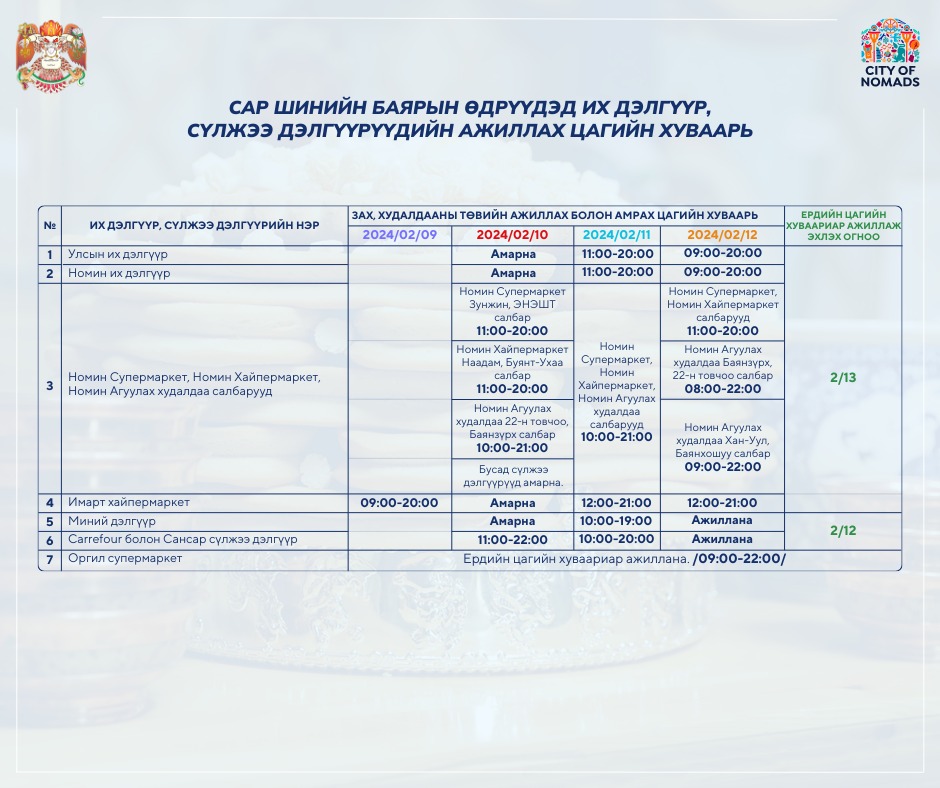 Сар шинийн баярын өдрүүдэд их дэлгүүр, сүлжээ дэлгүүрүүдийн ажиллах цагийн хуваарийг танилцуулж байна.