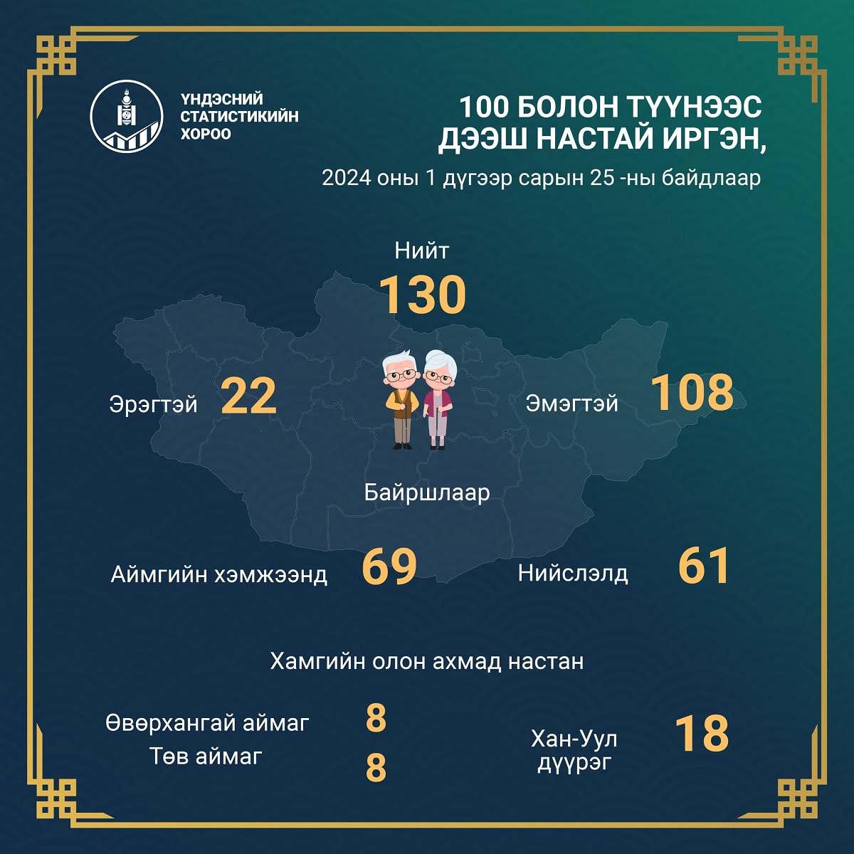 Үндэсний статистикийн хорооны мэдээллээр Монгол Улсын хэмжээнд 2024 оны нэгдүгээр сарын 25-ны байдлаар 100 болон түүнээс дээш настай нийт 130 иргэн байна. Үүнээс эрэгтэй 22, эмэгтэй 108 байна.